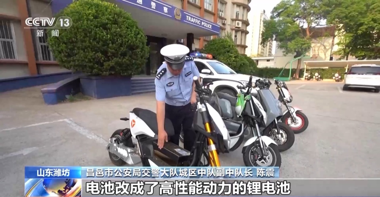 潍坊昌邑市公安局交警大队城区中队副中队长 陈震:转换了它的电板,电板改成了高性能能源的锂电板,调高了输出功率,使这个车速成倍的擢升。改装车辆制动系统,使车辆行驶中制动容易翻车,更换车辆后轮及后轮固定架,导致车辆合座结构不踏实,转换车辆原有电路,使车辆愈加容易自燃,加多高强度远光灯、爆闪灯,对其他车辆同样行驶视野酿成影响。