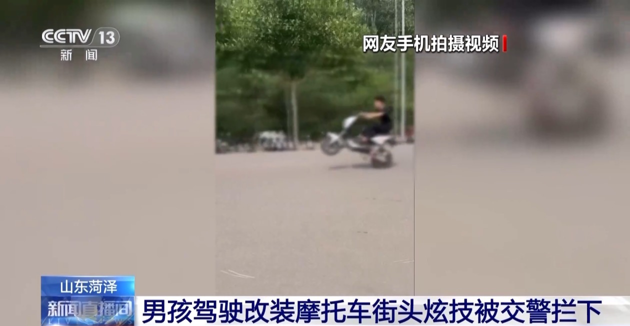 男孩驾驶改装摩托车街头炫技被交警拦下