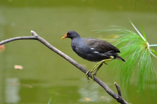 黑水鸡:黑水鸡成鸟两性相同,雌鸟稍小。额甲鲜红色,端部圆形。头、颈及上背灰玄色,下背、腰至尾上覆羽和两翅覆羽暗橄榄褐色。栖息于富裕芦苇和水生挺水植物的淡水湿地、池沼、湖泊、水库、苇塘、水渠和水稻田中,主要吃水生植物嫩叶、幼芽、根茎以及水生虫豸、蠕虫、蜘蛛、软体动物、蜗牛和虫豸幼虫等食品,其中以动物性食品为主。 黑水鸡是“三有”保护动物、广东省省级要点保护鸟类。